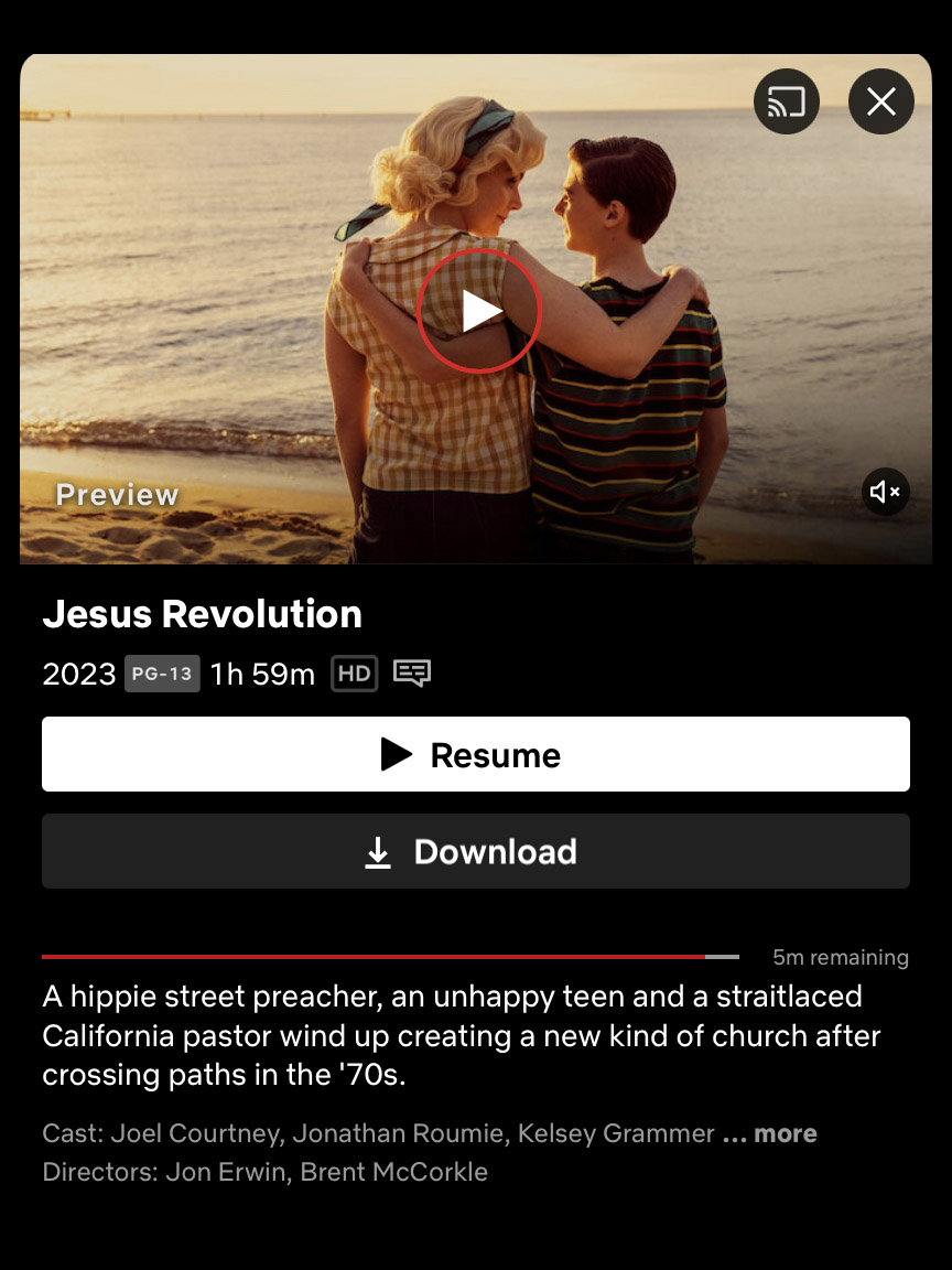 This past Monday the movie Jesus Revolution was released to Netflix. We don’t typically go to the movie theaters but I’ve wanted to watch this movie since I first heard about it. I was thankful it was released to Netflix. I’ve never seen a movie like this. The gospel of Jesus Christ was portrayed throughout the movie. As I said the movie gave very clearly the plan of salvation and did not water it down like is sometimes done in a movie. There was many moments I thought a line was noteworthy in the movie but another one would come. At the end the actor played by Kelsey Grammer said, “Let’s see what God has in mind.” This line reminded me of my life. When I’ve listed out key moments of life there’s no way I could predict what was coming, both the good and bad. Let me encourage you to watch Jesus Revolution and recommend it to a friend if you enjoy it like I did.