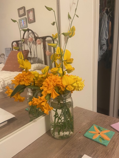 Let’s look at my fall tomatoes this morning. But first, I’d like to show a bouquet of flowers my daughter picked yesterday even from the pollinator patch.
