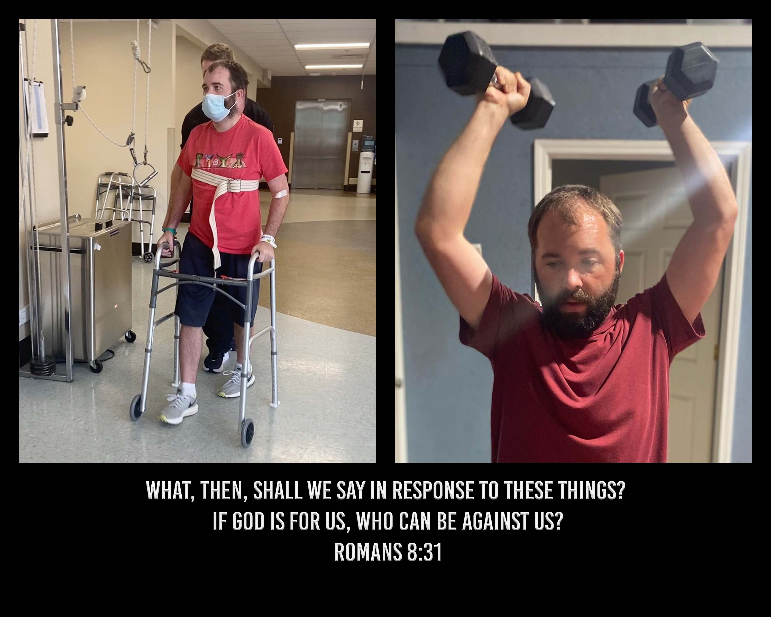 I’ve been meaning to get something here to help me remember it better but keep forgetting to write something. I do not write this as a selfish brag but to say thanks for the many prayers during this time. I’ve gone from someone who the hospital staff used a lift to get me out of bed to someone with the help of some awesome friends go workout twice a week. If it was up to me I figure I would still be sitting in the wheelchair BUT I’m encouraged each day by so many. There’s no way I could list them all so I won’t try but I’m very thankful for my God who is sovereign who in his love for you and I sent his son – Jesus to die for us, family who loves me, and friends who encourage daily.