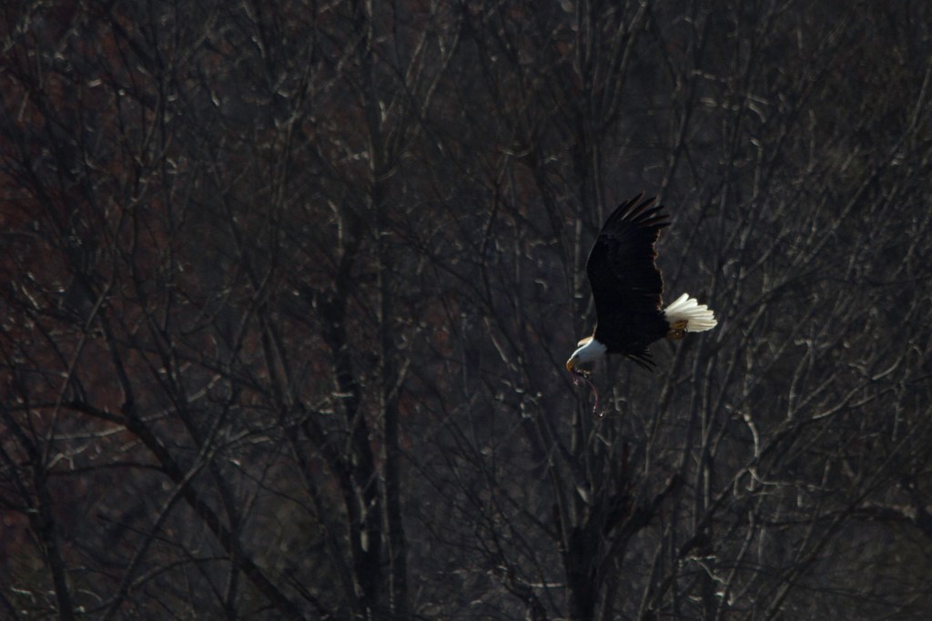 Years ago Christy bought me a trip to north Arkansas and a stay at a trout fishing resort up there called Gaston’s. When we got there the river was high and flowing very fast. I ended up not fishing. My first morning I got up early to walk along the river and spotted a few eagles. I had my camera with me and snapped a few photographs. I love Eagle photography. I continued walking down the river bank and came to the end of the trail so I turned back. As I got back near the resort I ran into another photographer. He pointed me to an Eagle nest across the river and we stopped to set up to take photographs. After visiting with the photographer I found out he was a very well known Eagle photographer that I had been following his work for years. I left and went to check on Christy. She was going shopping in Branson, MO and I decided to stay and try to get some more Eagle photos. I told her goodbye and be safe then walked back down to the nest. My new photographer friend was still there. We ended up staying right there and visiting all day. This was a treat for me. Eagles will pair up and take turns sitting on the eggs in the nest and only getting up off the eggs every so often to turn the eggs. Every few hours the Eagle on the nest would get up to call its mate to switch. The mate would bring back some food then they would switch places. This time switching was the best time to get a photo plus the times they got up to turn the eggs. Else there was little activity around the nest. This led to a lot of time to visit. When something would happen it would be all of a sudden then over, the waiting game would then start all over.