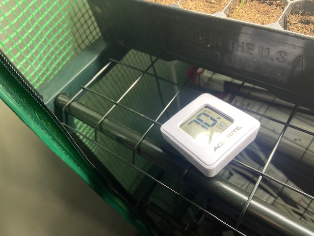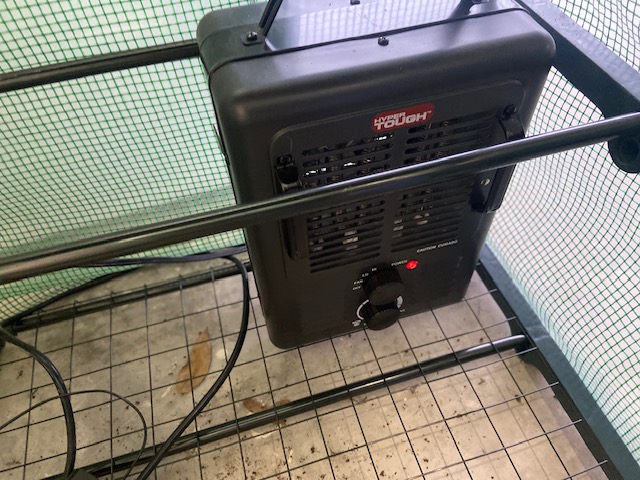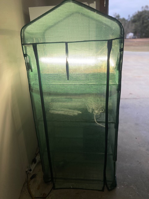 Here’s a few picture of my seed starting setup. I’ve never used a greenhouse as I used to have a seed starting area in my utility room. I’m heating this with small electric heater. It has cooled off again but it was keeping the greenhouse heat to a little above 80 degrees. I’ve got it turned down but could get it back to that temperature if I wanted. I’ve learned in seed starting that having an abundance of light is key. The ones pictured here are just some LED lights I bought at Wal-Mart.