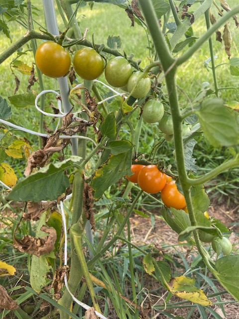Yep, my favorite sight in the garden, a Tomato Hornworm! Now back to my snack!! I’ve got quite a few more ripening now. I believe this is my best year on Sun Golds. I was a bit worried because I only had two plants survive my seed starting earlier this year and then the plants looked very pitiful for a while but they’re looking great right now.