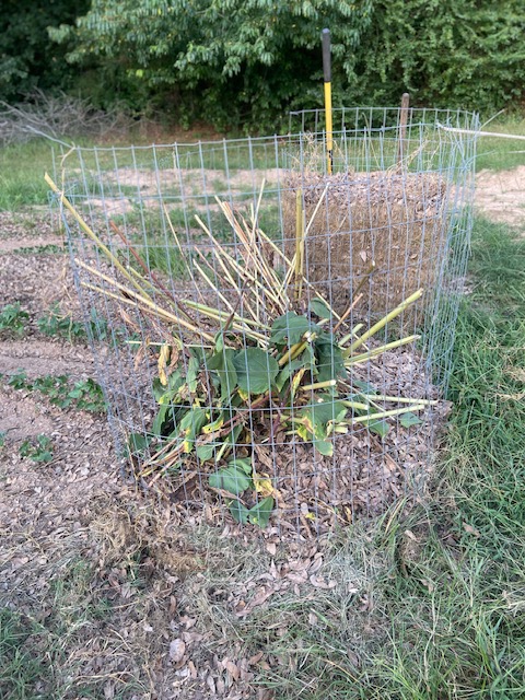 Next, is an update on my composting projects. I mentioned last week building a second wire cage. In it I’ve done grass clippings and leaves like my first bin but I’ve also added the pea hulls from when we shelled peas as well as some sunflower stalks.