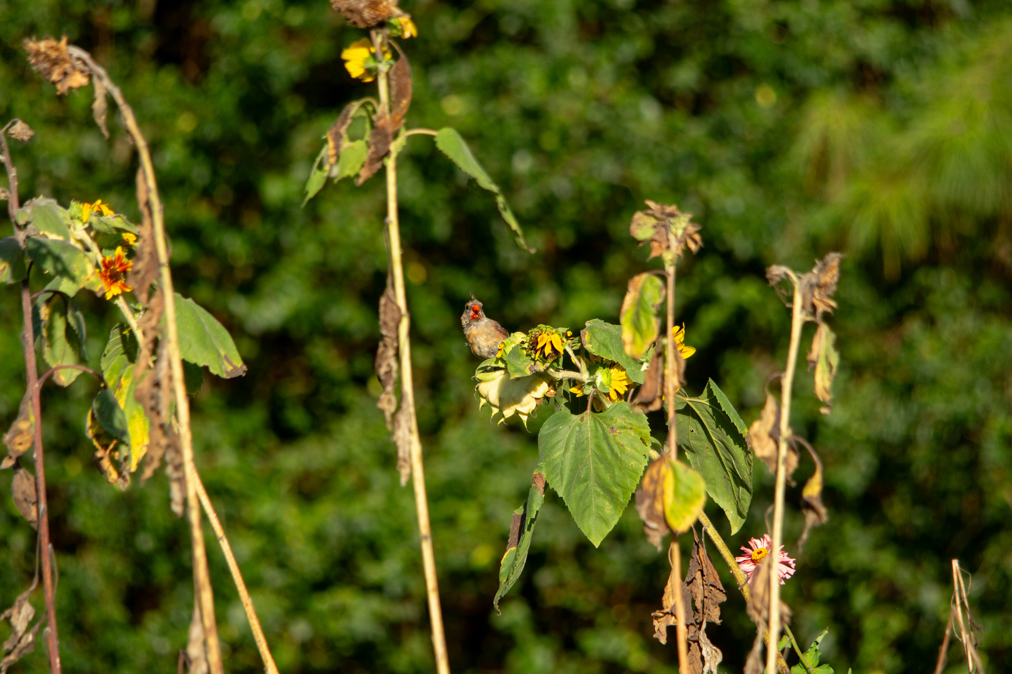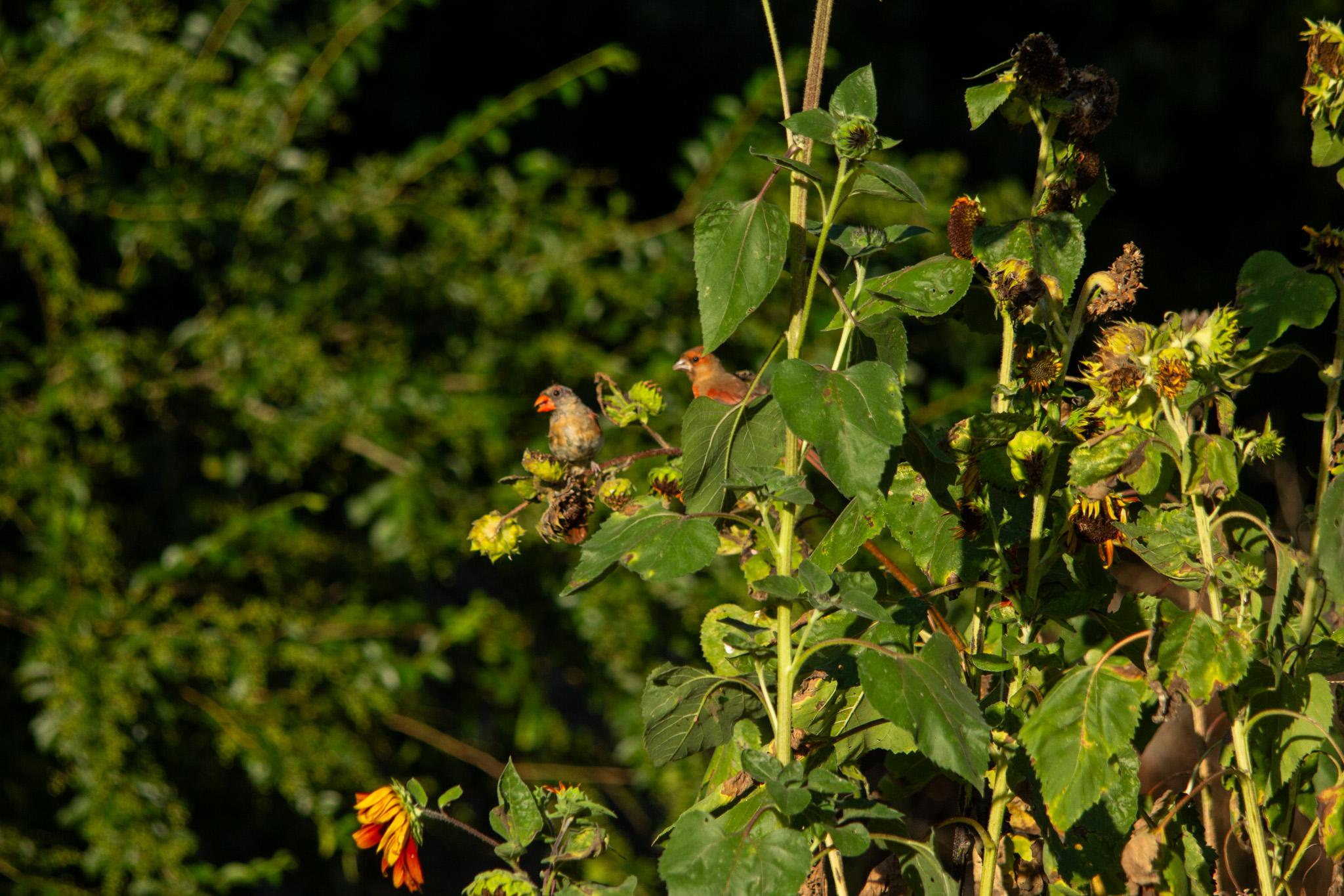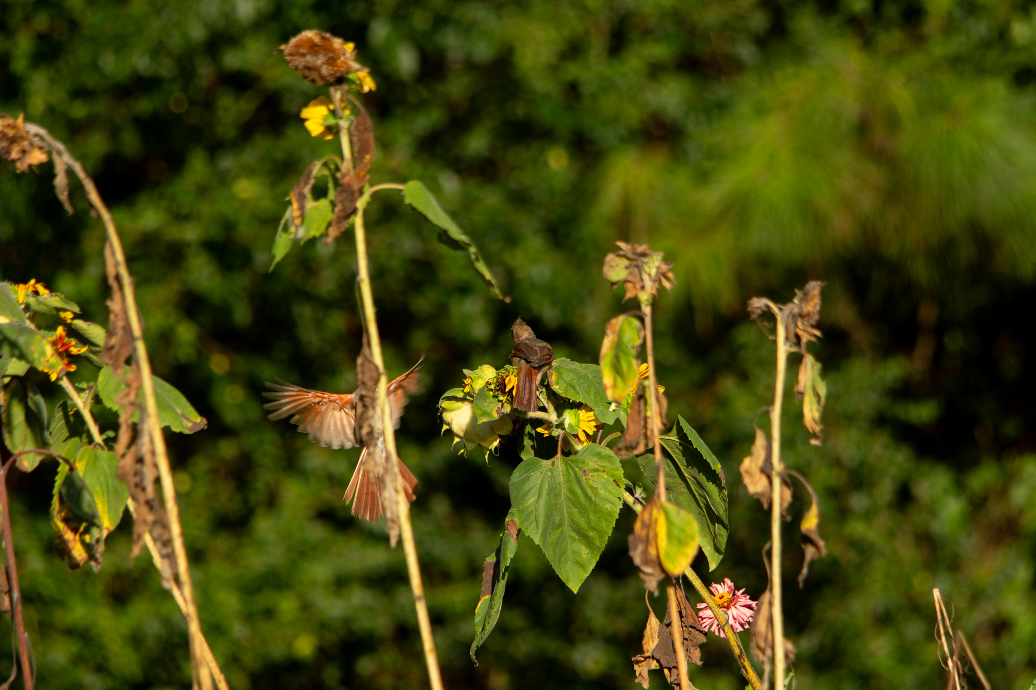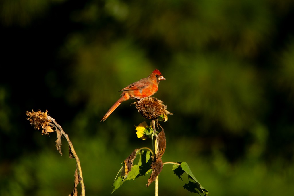 In the evenings when I go down to my garden I seem to always scare birds out of my sunflowers. I’ve still got a few plants down there from sunflowers I planted later than my others. I’ve tried to plant some more but so far they haven’t germinated with the heat we have right now. Anywho back to the birds…This evening I decided to get my camera and set it up near my garden to see what I could photograph. It is HOT! I did get a few photos before heading in to cool off!